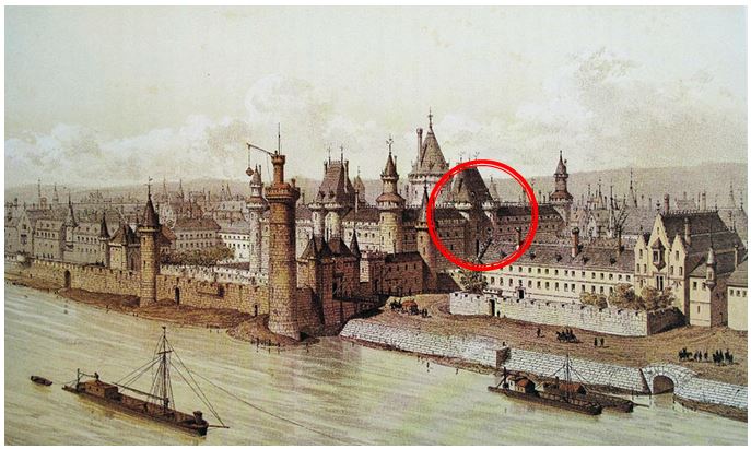 La tour du Coin fait partie de l’enceinte de Philippe-Auguste qui remonte vers la droite, avec la porte du Louvre aux tours jumelles encadrant le pont levis ; sur l’arrière, l’hôtel Bourbon. Côté Seine l’enceinte de Charles V.