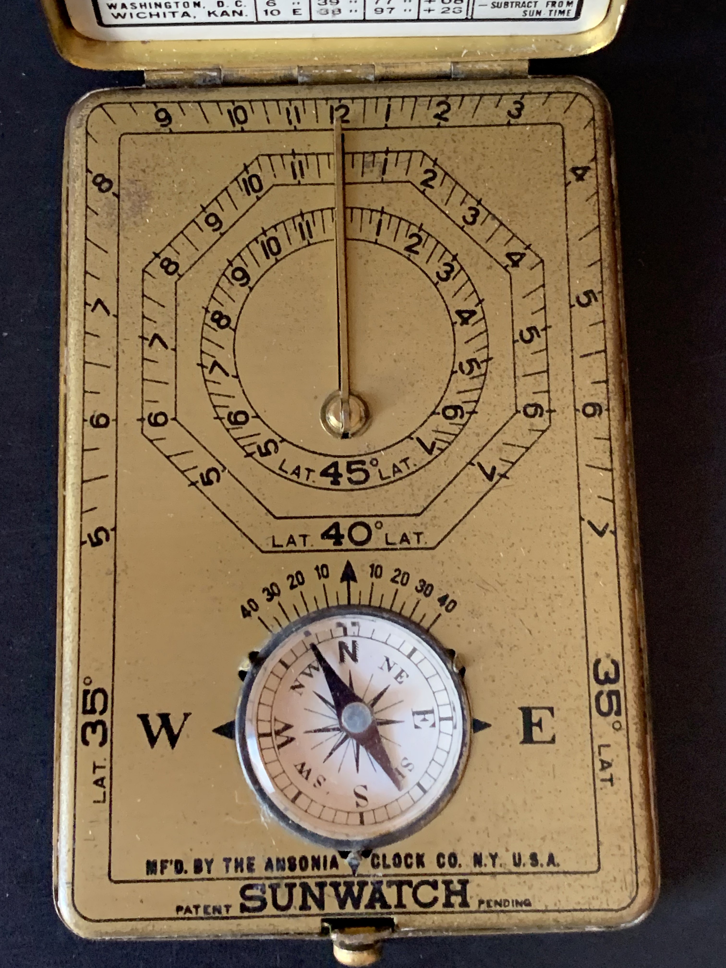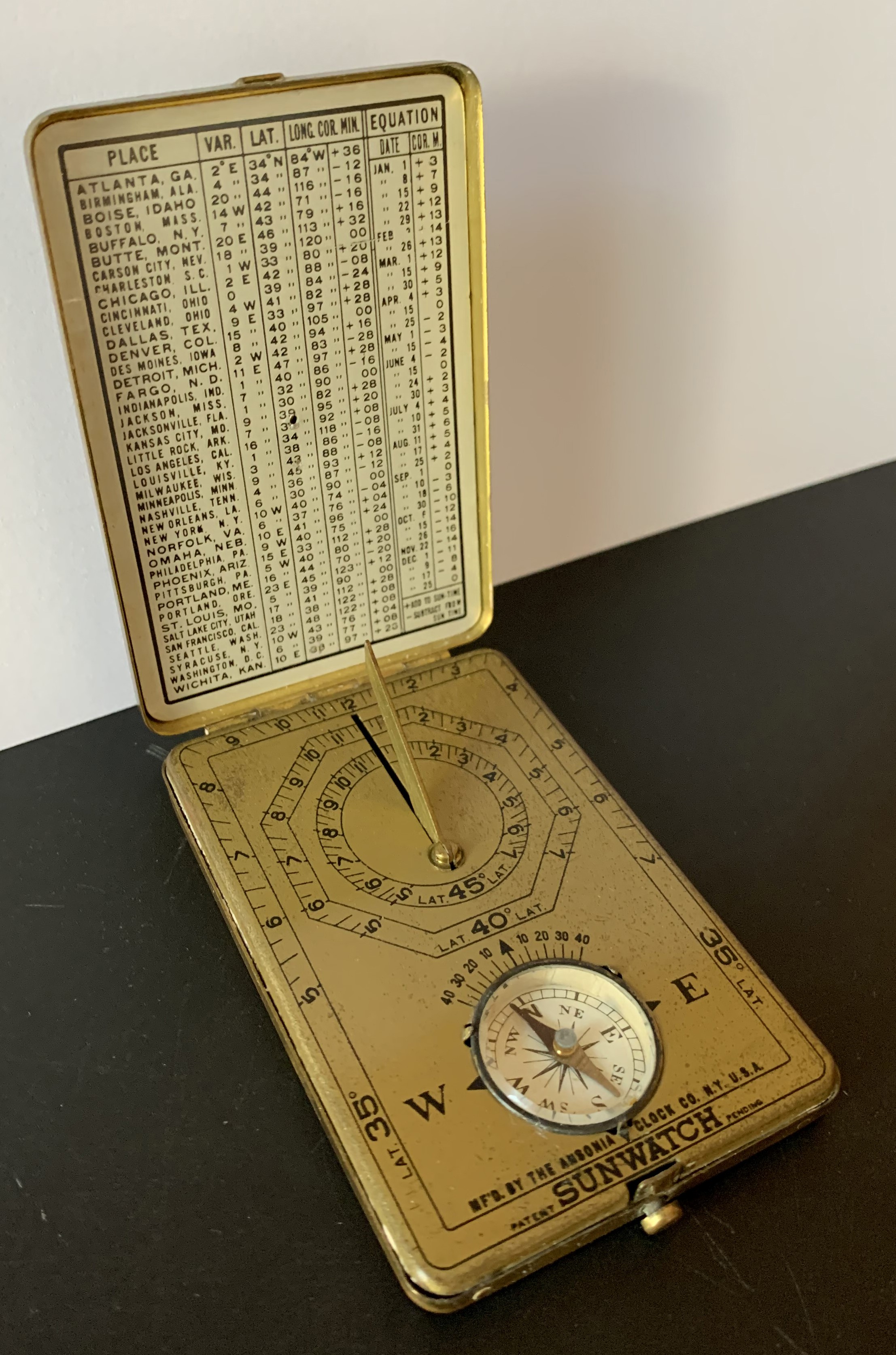 Une fois ouvert, nous voyons qu’il contient une petite boussole pour l’orienter, et qu’il est muni d’un fin gnomon. À l’intérieur du couvercle, une table des villes américaines classées par ordre alphabétique donne une correspondance pour recalculer l’heure.