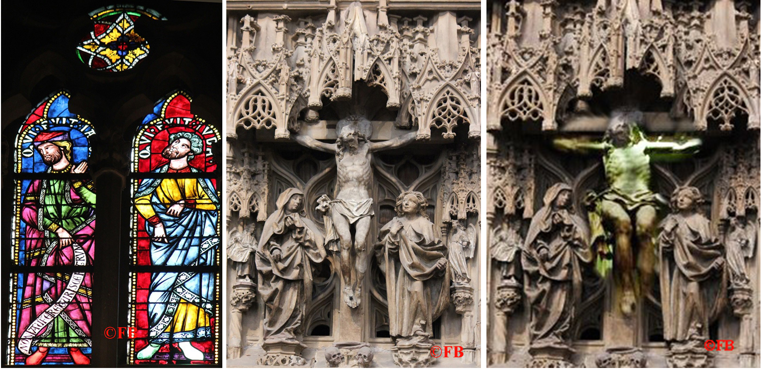 (à gauche : vitraux représentant Jacob et Juda – à droite : illustration du rayon vert sur le Christ)