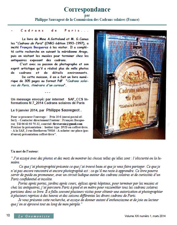 François Bocqueraz a ici réussi un beau tour de force, résultant d’un travail de longue haleine et qui comble un vide sur les cadrans solaires de Paris. Je suis convaincu qu’il remportera un vif succès auprès des amateurs de gnomonique et de tous ceux qui souhaitent découvrir Paris en alliant art et science.