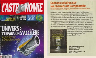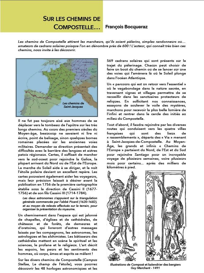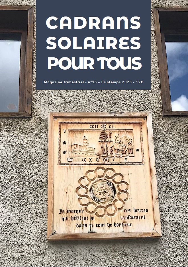 Ce mois-ci, « Cadrans solaires pour tous » dans son N° 15 – Printemps 2025 – me fait l’honneur sur deux pages d’évoquer mon voyage à Compostelle, où les cadrans solaires et les horloges astronomiques ont remplacé les coquilles du balisage.