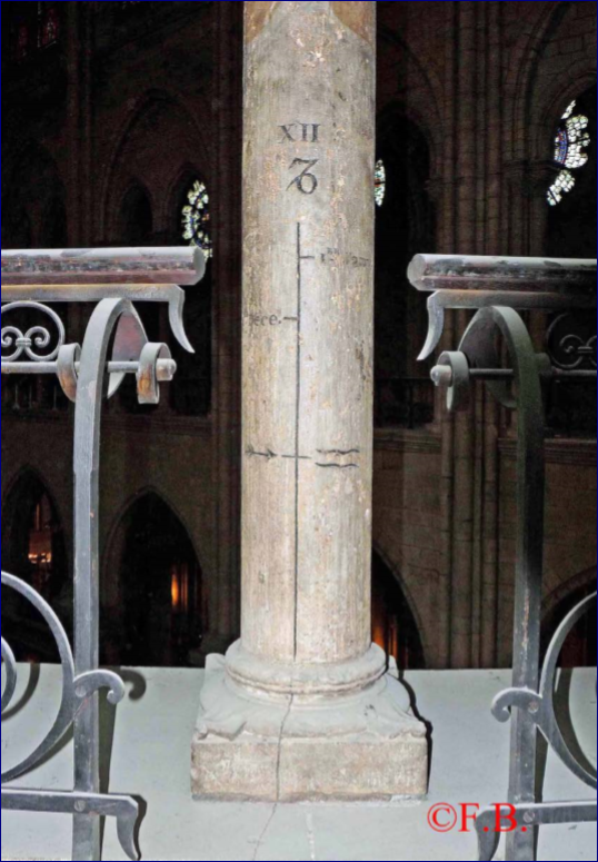 La cathédrale Notre-Dame de Paris a pris feu… Une pensée pour Notre-Dame de Paris avec une photo de sa méridienne intérieure. Elle est située dans les tribunes au-dessus du chœur, sur un pilier de la galerie. L’œilleton est absent, le vitrail ayant été changé durant les travaux de restauration en 1761.Photo et commentaires issus du livre numérique de François Bocqueraz : Cadrans solaires et méridiennes disparus de Paris, « Un parcours alchimique » https://cadranssolaires.com/cadrans-solaires-a-propos/ |