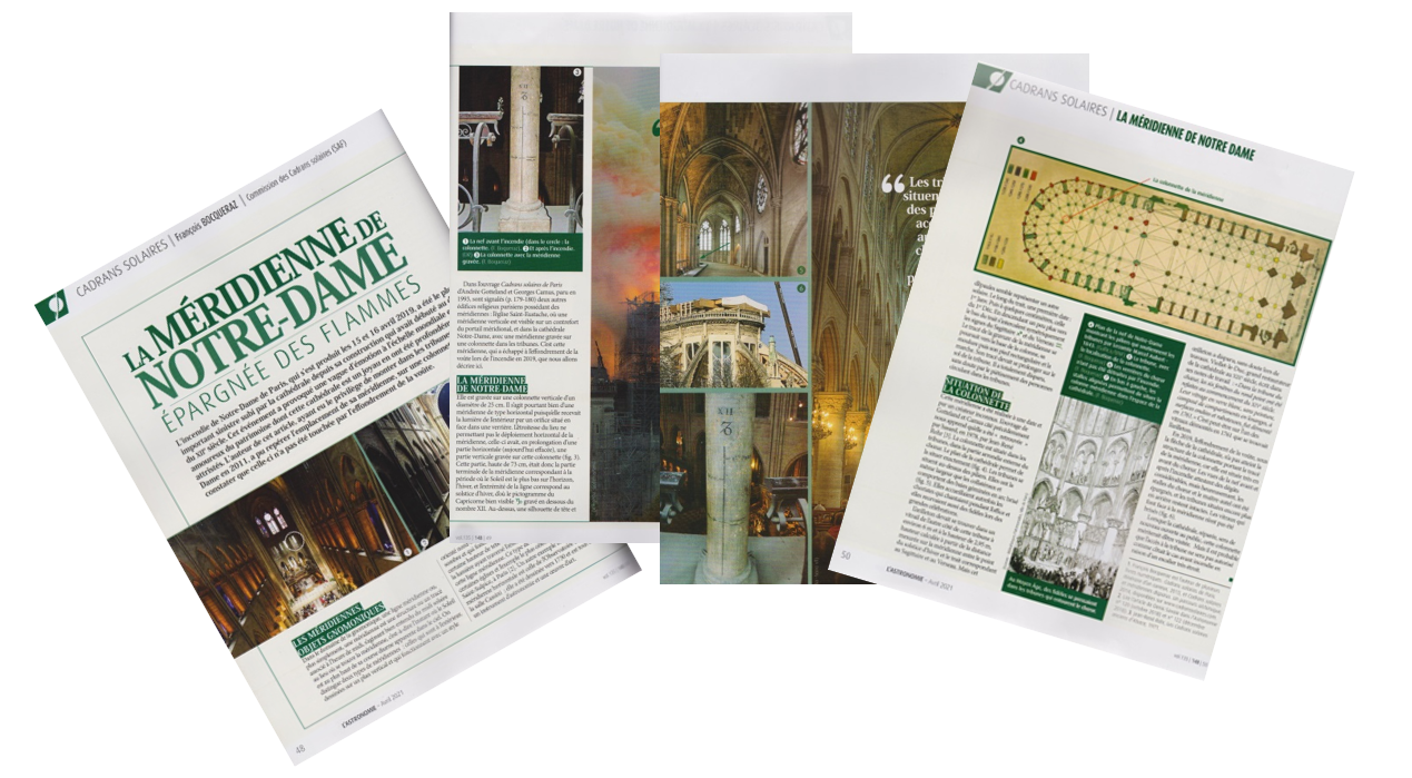 Les édifices religieux parisiens abritaient souvent des méridiennes solaires. L’église Saint-Sulpice en possède une très grande se terminant par un obélisque, l’église Saint-Eustache en détient une sur la façade extérieur sur le côté du grand portail. La cathédrale Notre-Dame de Paris possède la sienne bien cachée qui a échappé miraculeusement aux flammes. Elle se situe dans les tribunes au-dessus du chœur, sur un pilier de la galerie. L’œilleton est absent, le vitrail ayant été changé durant les travaux de restauration en 1761.