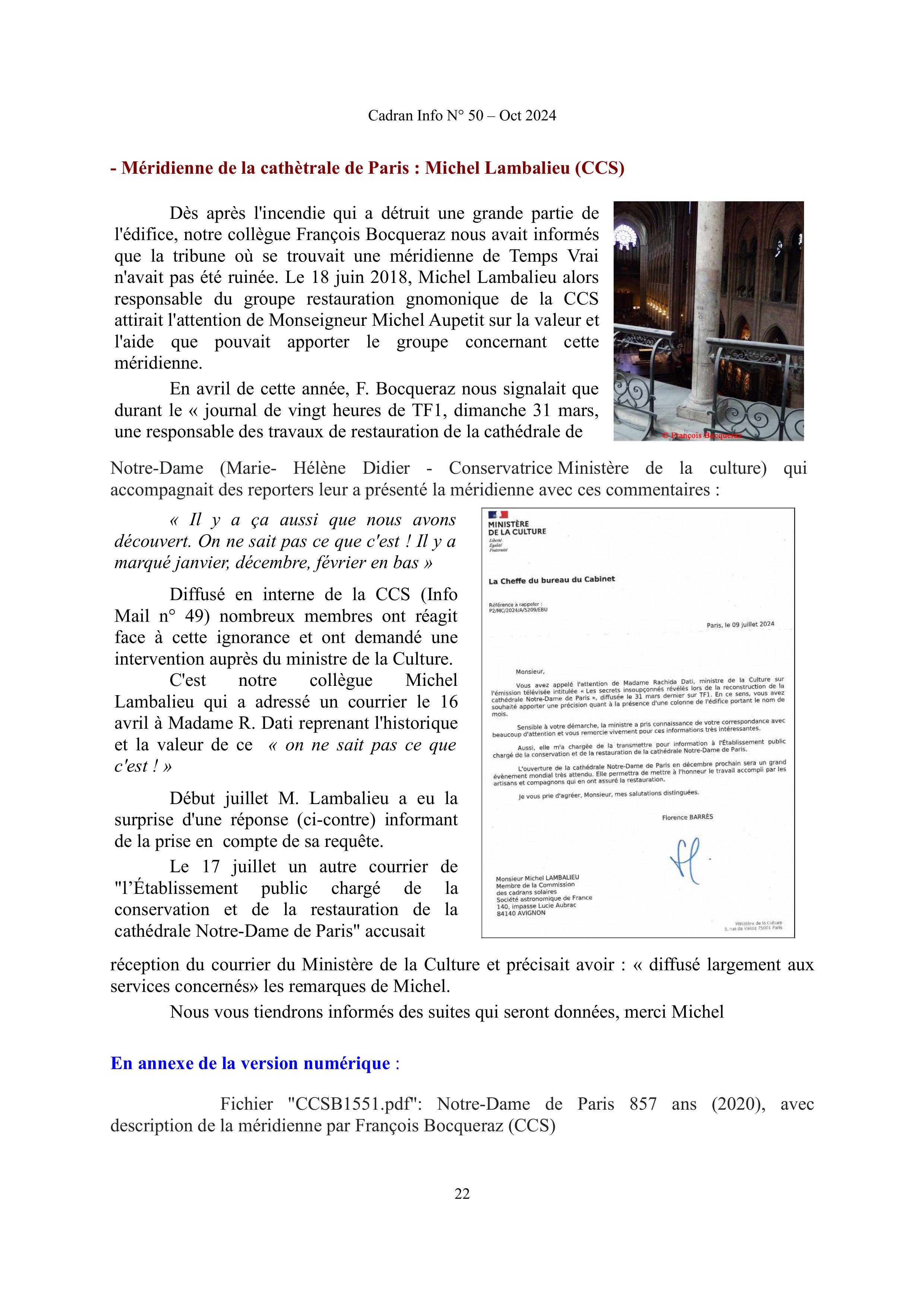 Vous trouverez ci-dessous le courrier envoyé à Madame la ministre de la Culture Rachida Dati, suite au reportage du vingt-heures de TF1 sur les travaux de restauration de la cathédrale Notre-Dame de Paris, où Madame Marie- Hélène DIDIER – Conservatrice au Ministère de la culture – dit tout ignorer (sic) de la « Méridienne du temps vrai » qui fut tracée dans les tribunes (…).